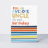 A colourful birthday card for an uncle with simple, sophisticated patterns of checks, stripes and spots. This striking card, suitable for male birthdays, is printed on textured board and finished with pops of gold foil. Supplied with a bespoke blue envelope