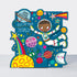 This fun children's birthday card comes with a bright, hand painted astronaut design. This card is folded with a reverse fold and it features a playful die-cut and cut-out shape which compliments and interacts with the design. It is printed on textured board with vibrant inks and finished with hot gold foil. Supplied with a coordinating coloured envelope.