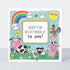 A lovely birthday card with a bright farm animals theme. Featuring a hand applied 3D die-cast badge surrounded by hand painted illustrations. Printed on textured board and finished with gold foil, supplied with coloured envelopes.