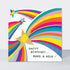 This eye-catching birthday card features die-cut front and back pages with illustration on both sides of the card, creating a double layered image. Printed on textured board with vibrant neon inks, they are finished with hot gold foil.