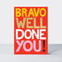 Designed in a bright, bouncy style, this wordy Good News congratulations card focuses on type, colour, and pattern. The design features a bold 'Bravo Well Done You' caption and is printed on quality board, finished with chunky gold foil and embossing. SIZE: 170mm x 120mm. Supplied with a colour co-ordinated envelope.