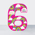 An eye-catching Age 6 birthday card featuring a bold, die-cut number. Illustrated with colourful hand-drawn characters, with a cute rainbow theme. Printed with bright, neon inks on textured board and finished with hot gold foil. Supplied with a colour co-ordinated envelope.