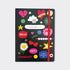 This chunky, perfect-bound notebook features a 'Friendship' design on a black background, with a playful collection of vibrant, hand-drawn icons including hearts, cherries, stars, flowers, and cute captions like 'Best Bud' and 'Hey!'. It has 240 lined pages, contrasting linings, rounded corners and an elastic closure. The cover features sparkling gold foil highlights.