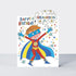 This fabulous 'To a super Grandson' birthday card in a fun super hero design is printed with neon inks on textured board. It is embellished with sparkling gold glitter and features a die-cut top. Supplied cello wrapped with a brightly coloured envelope.