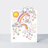 This pretty new baby girl card in a sparkling rainbow design is printed with neon inks on textured board. It is embellished with gold glitter and features a die-cut top. Supplied cello wrapped with a brightly coloured envelope.