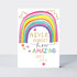 It's all about positivity and self care with this card. Suitable for children and adults, this card features an uplifting message 'Never forget how amazing you are' to send 'just because' or to keep for motivation. It is finished with shiny gold foil, neon pops of colour and deep embossing. This card is supplied with a neon pink envelope.