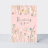 This pretty thinking of you card is inspired by beautiful pressed wild flowers. A combination of hand-drawn illustrations and scanned real flowers, mixed with gold foiling and hand-applied crystal jewels, creates a delicate overall look. Printed on high quality board and supplied with a textured white envelope.