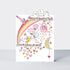 This beautiful New Granddaughter card in a sparkly rainbow design is printed with neon inks on textured board. It is embellished with gold glitter and features a die-cut top. Supplied cello wrapped with a brightly coloured envelope.