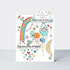 This gorgeous New Grandson card in a sparkly rainbow design is printed with neon inks on textured board. It is embellished with gold glitter and features a die-cut top. Supplied cello wrapped with a brightly coloured envelope.